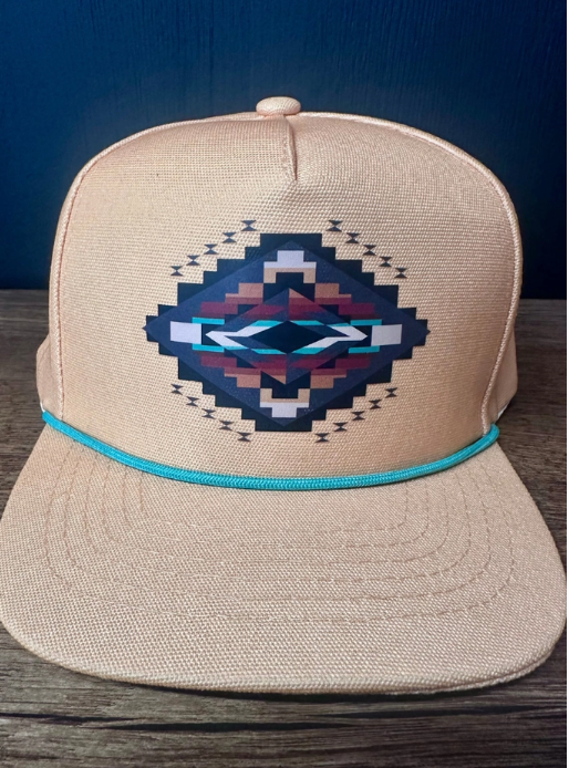 Add a splash of color and culture to your outfit with this mustard cap, featuring a vibrant turquoise band and a bold Aztec design at its center. Perfect for those who love playful style with a touch of tradition.